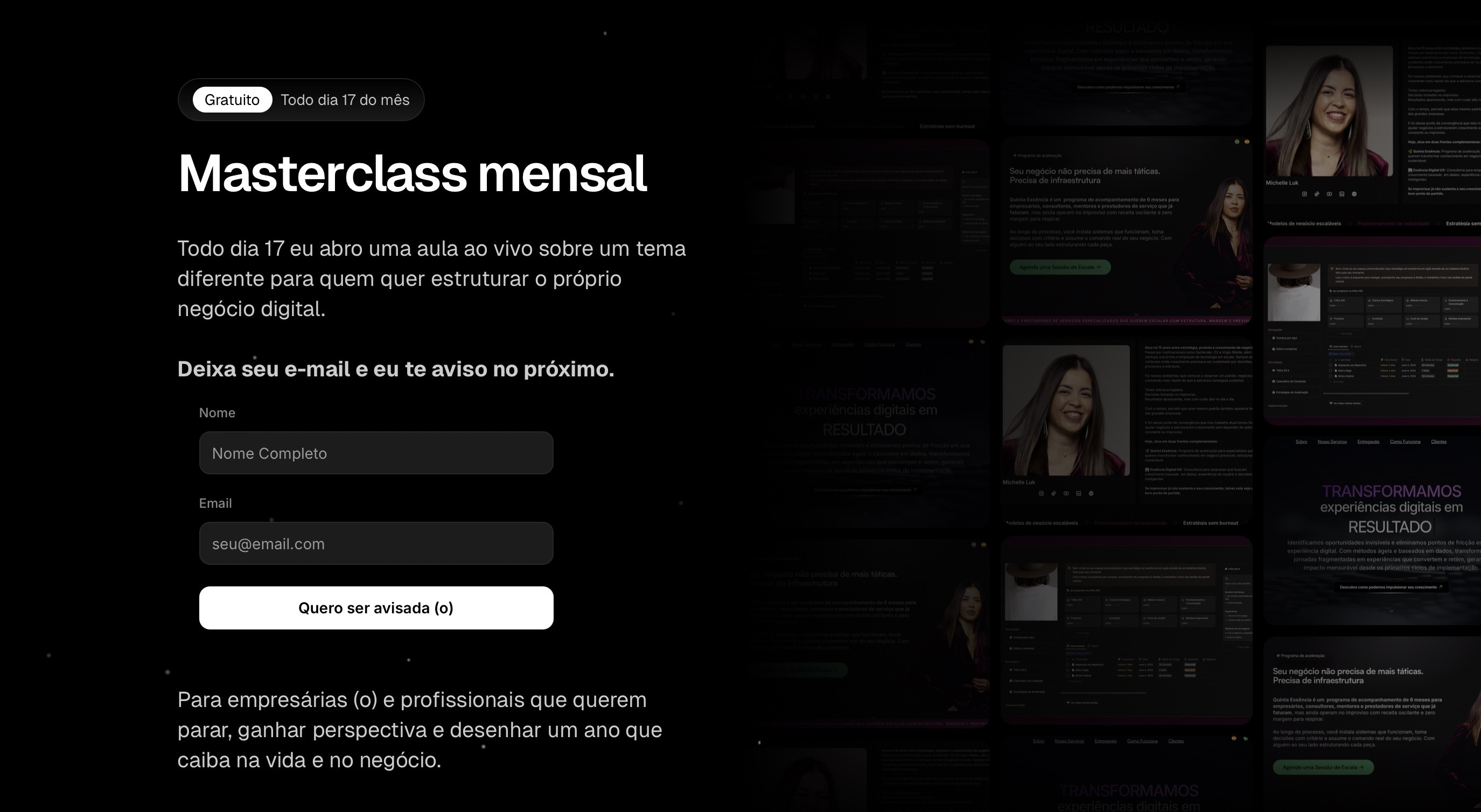 Michelle me deu clareza, estratégia e organização pra transformar ideias soltas em direção real. O que era só um sonho virou plano. Ela entrega mais do que conteúdo: entrega estrutura, coragem e visão.
