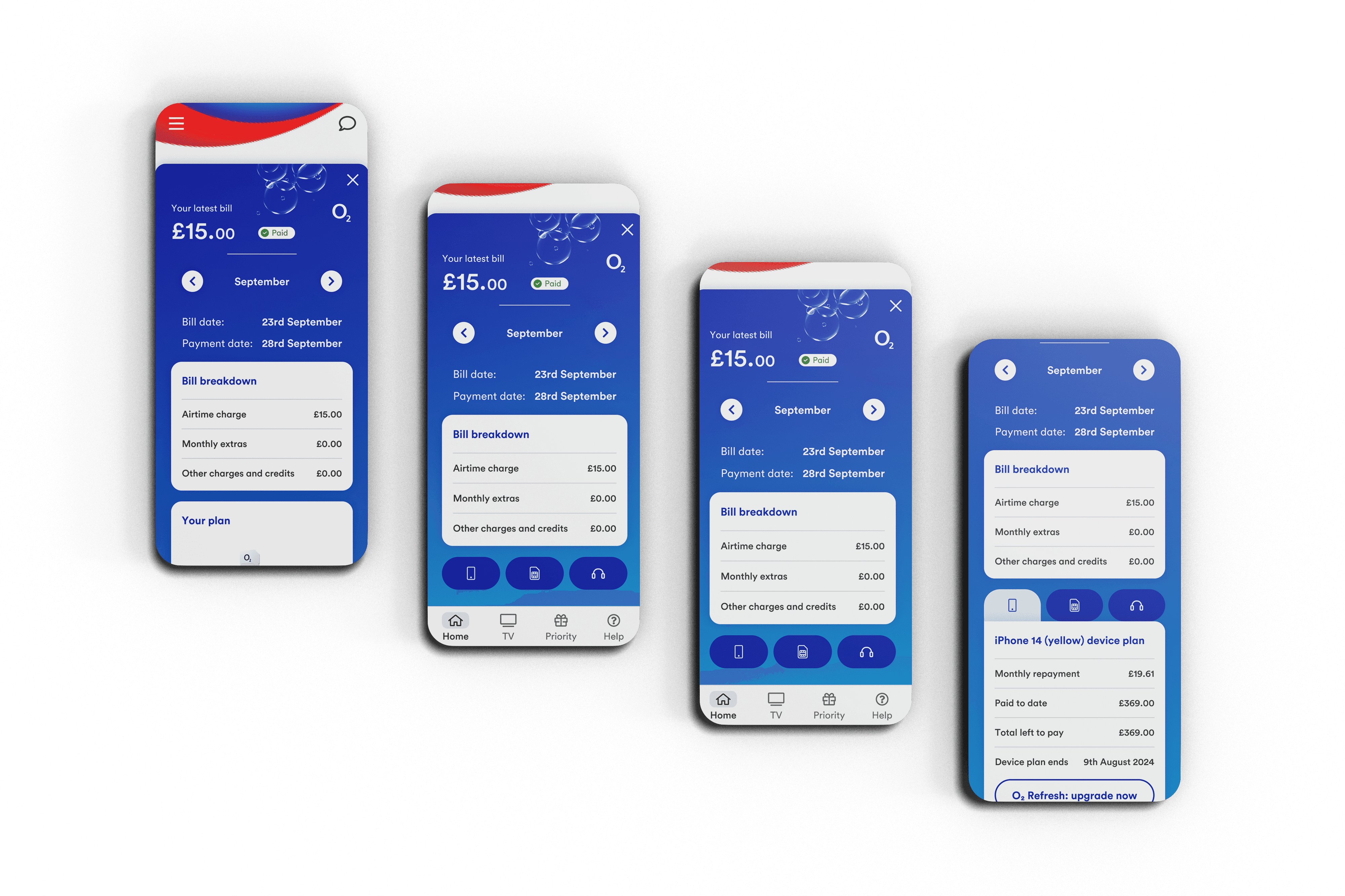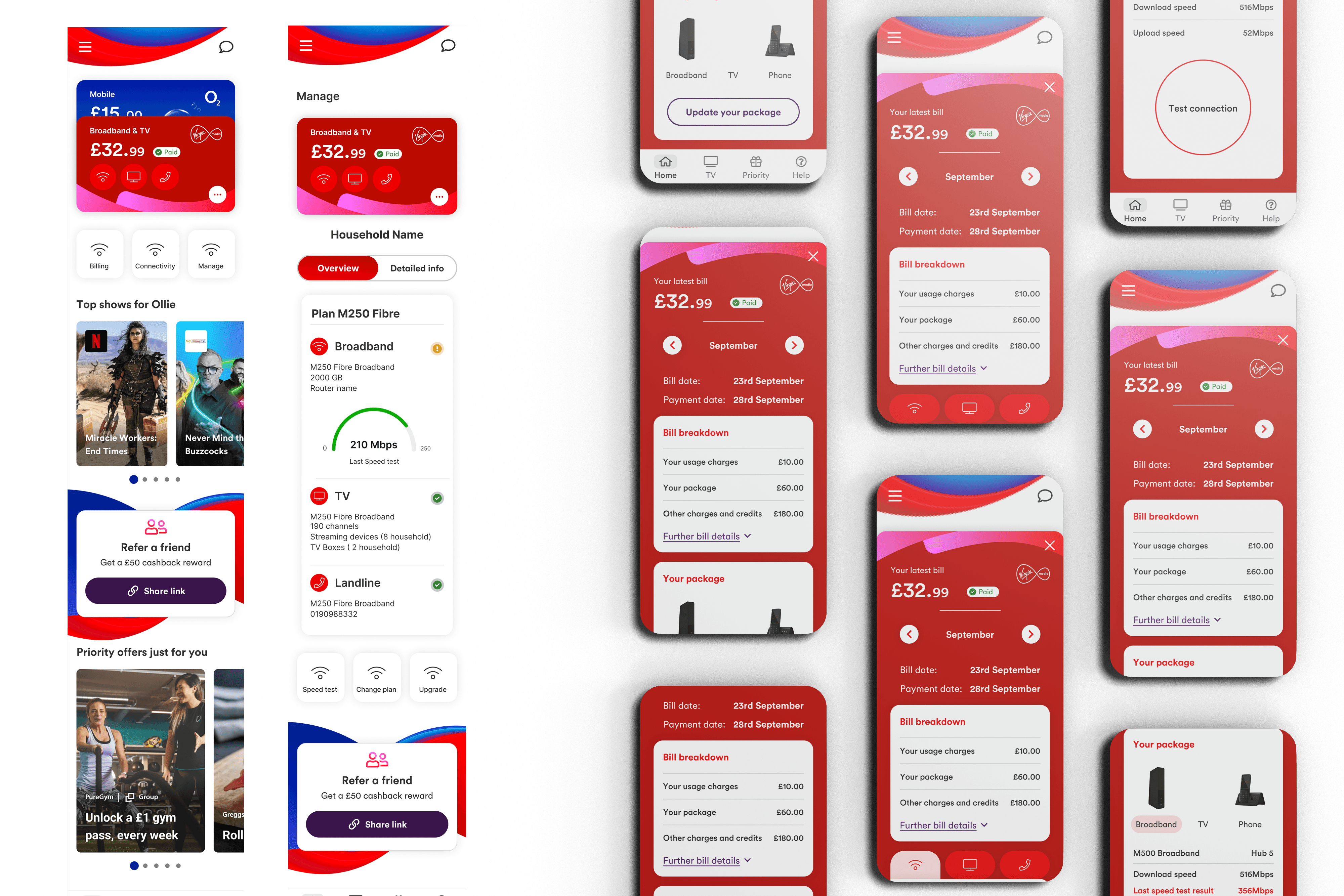 The design process began with a holistic review of VMO2’s existing digital services, including mobile, broadband, billing, and entertainment offerings. We conducted stakeholder interviews and cross-departmental workshops to map internal workflows and dependencies.Simultaneously, user research was conducted through surveys, interviews, and usability tests to uncover pain points across the customer journey.