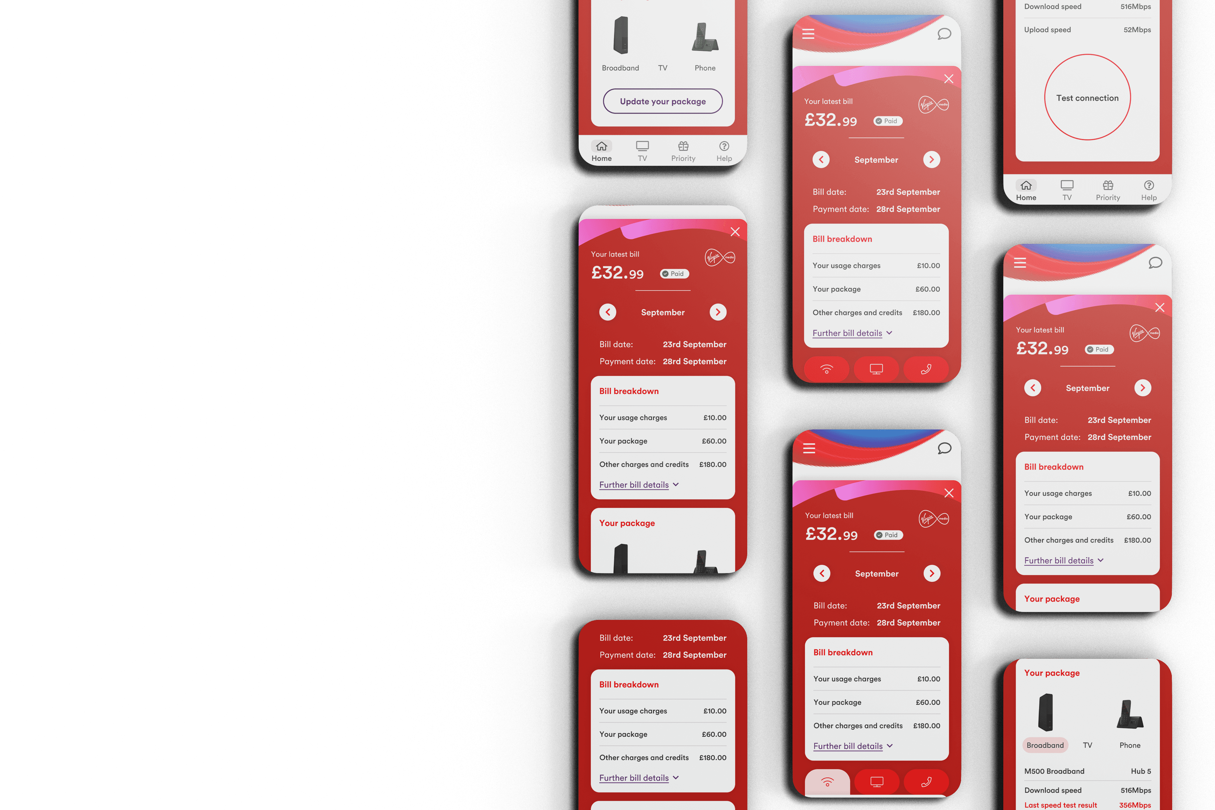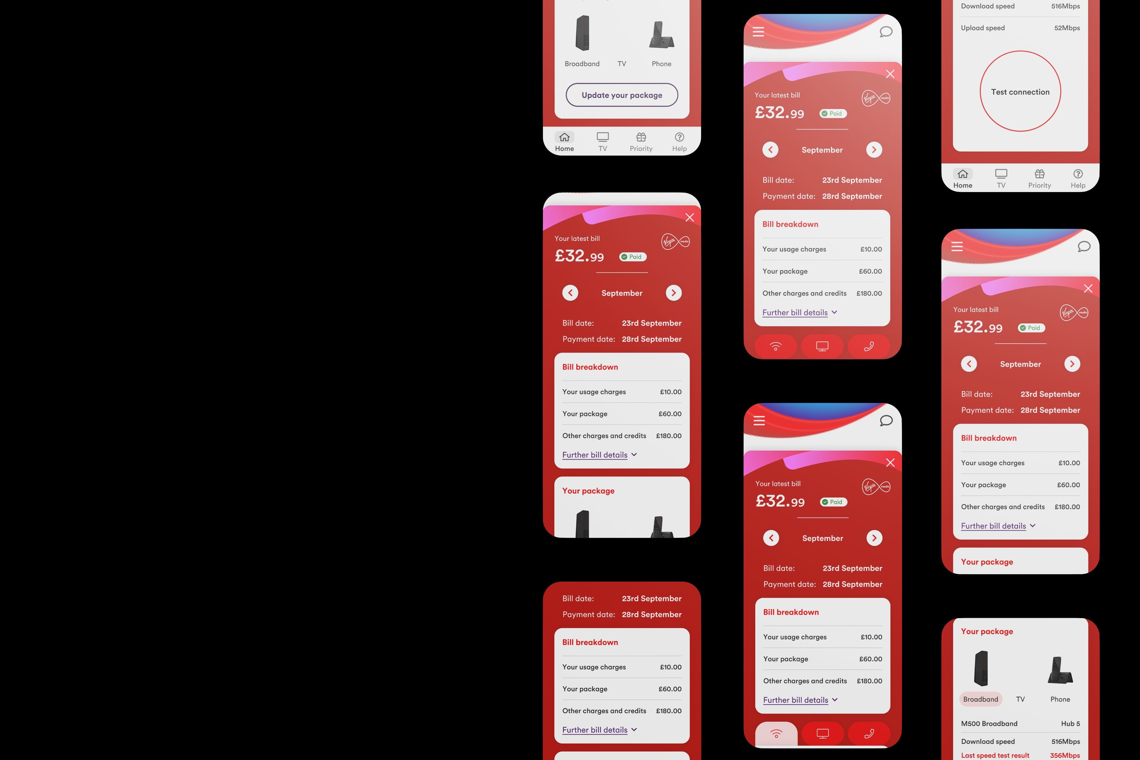 VMO2’s challenge was to merge multiple existing apps (each offering different functions) into a single, scalable experience without overwhelming users. They needed an intuitive app design that made managing bills, tracking service status, accessing support, and discovering new services simple and efficient. The solution also had to accommodate diverse users, from mobile-first customers to broadband-heavy households.